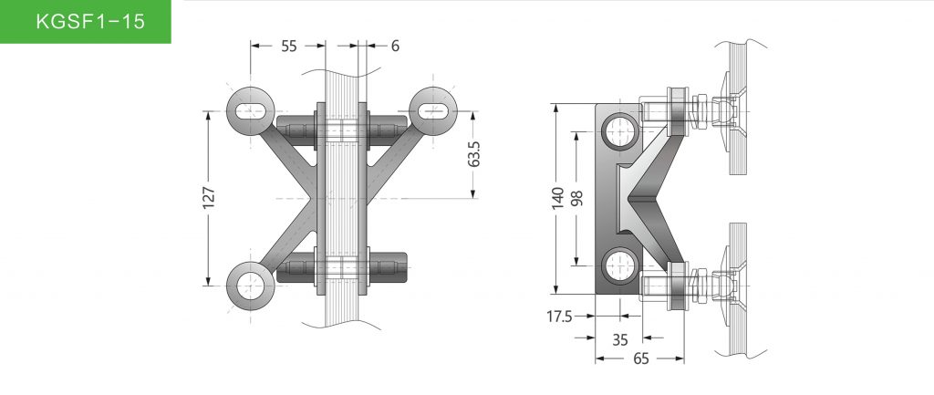 This fitting is used to attach two single glass panel to a wall or structural fin.